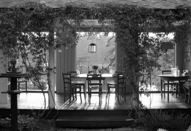 Directly opposite the entrance doors, on the far side of the courtyard, is the dining room, which mediates between indoors and outdoors with both windows and doors in the exterior wall to the sea while the wall to the courtyard has been completely removed (below).