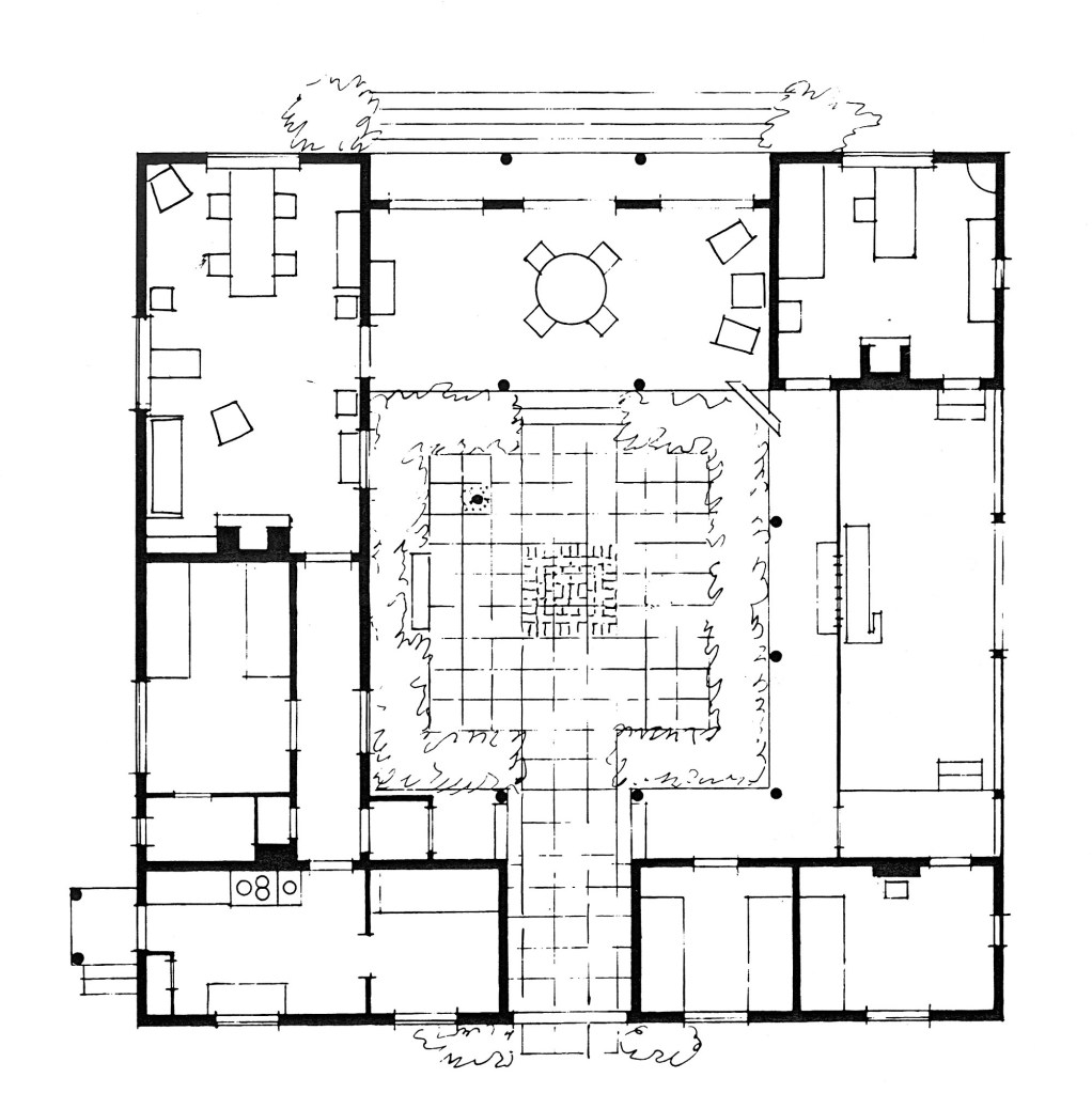 If you happen to be tramping across Villinki Island – one of the hundreds of islands in the archipelago around Helsinki (what a lovely thought in these days of no travel), you would soon come across a very modest, single-storey, timber-clad building, sitting amongst the birch trees, above the rocks, on the edge of the sea. A pair of traditional diagonally-boarded double doors appear to be the entrance to what might be a barn or wood store, but once they are opened, they reveal the most beautiful courtyard space at the centre of what is a delightful Finnish summer house (above). It was built by architect Oiva Kallio in 1924, and as an enthusiastic Classicist, he based his house on the model of the Roman atrium (as similarly attempted by Alvar Aalto in his contemporary unbuilt house for his brother). Its plan (below) is deceptively simple but on closer study reveals a considerable informality within its perfectly square outline, to respond to the needs of everyday family life.