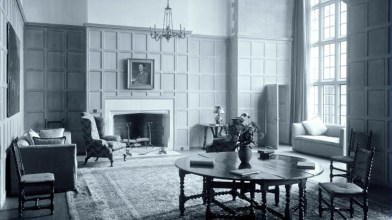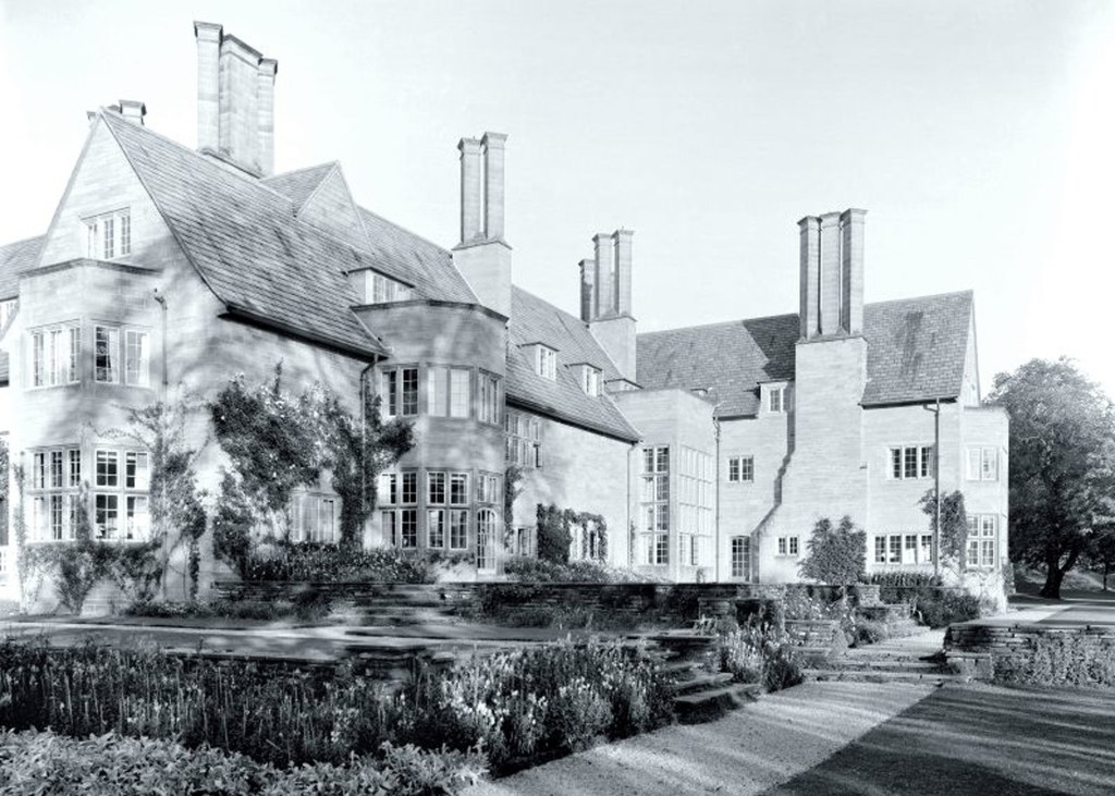 By the time it was ready for occupation, the Euan Wallaces were divorced (Edina going on to marry a further 4 times and gain infamy in ‘Happy Valley’ in Kenya) while David, rather bizarrely, had married Barbara, the eldest daughter of Sir Edwin Lutyens. There is certainly more than a hint of Lutyens in Miller’s design, with Little Thakeham providing the two-storey hexagonal bay window, the internal balcony to the hall and the tall diagonal chimney stacks, while the great double-height glazed bay and arched entrance door from Deanery Garden are also re-employed, along with the triple-gabled entrance wing from Lutyens’ Tigbourne Court. To further cement the link, the great Gertrude Jekyll was commissioned to create the gardens in the 1920’s.