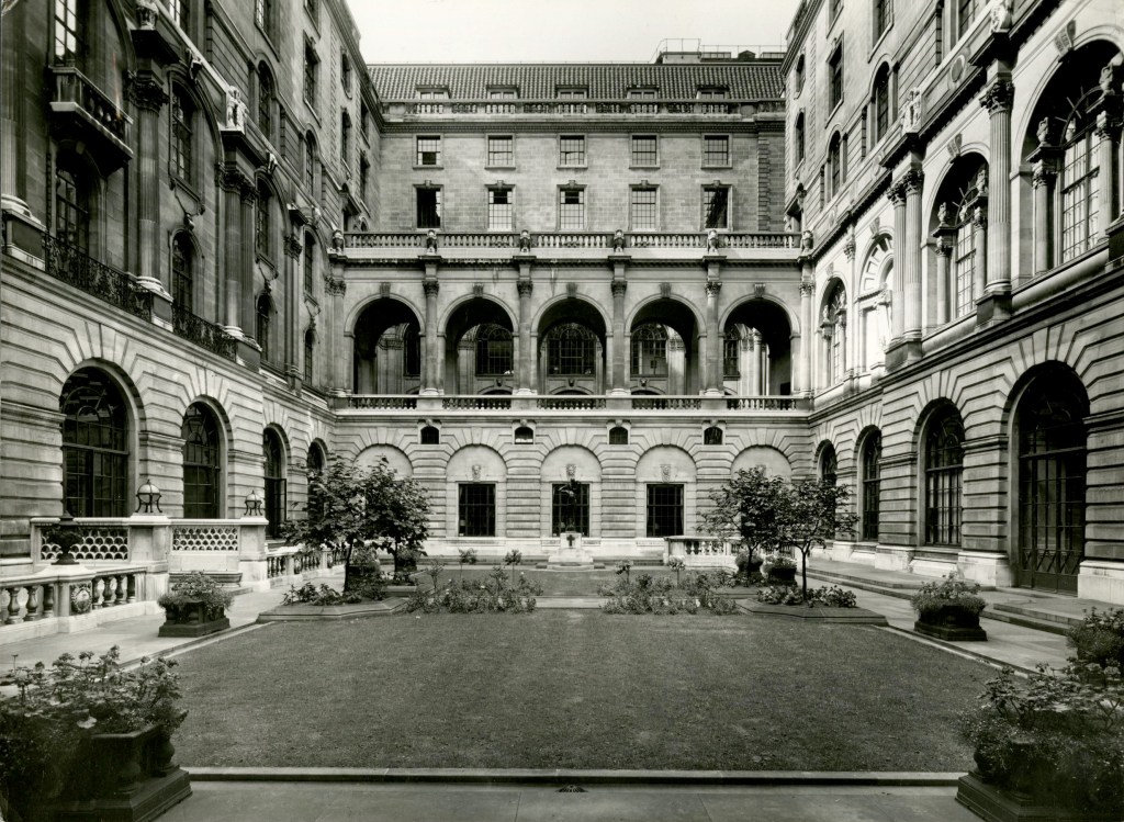 Herbert Baker was appointed by the Bank to advise them on how best to redevelop their site (with Lutyens having already proposed total demolition). He immediately recognised the quality of many of the existing buildings and proposed not only that the great encircling wall which Soane had designed, should be saved in its entirety, but also that as many of the banking halls behind it as possible should be retained, with tall new buildings raised in the centre of the site and several floors of new accommodation below ground also created so that all the Bank’s activities could again be brought together on Threadneedle Street.