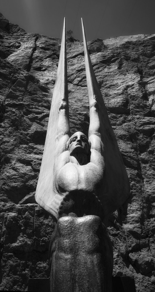 While the dam’s extraordinary power and beauty is derived from the contrast between its perfect man-made curve and the rugged sheer walls of the surrounding rock, it was raised to the sublime by Los Angeles architect Gordon B. Kaufman’s exquisite Art Deco detailing and the addition of several sculptures by Oskar C.W. Hansen, including his two magnificent bronze winged figures and his memorial to the 112 workers who had been killed during construction. Completed in November 1933, it remains one of the great wonders of the modern world.