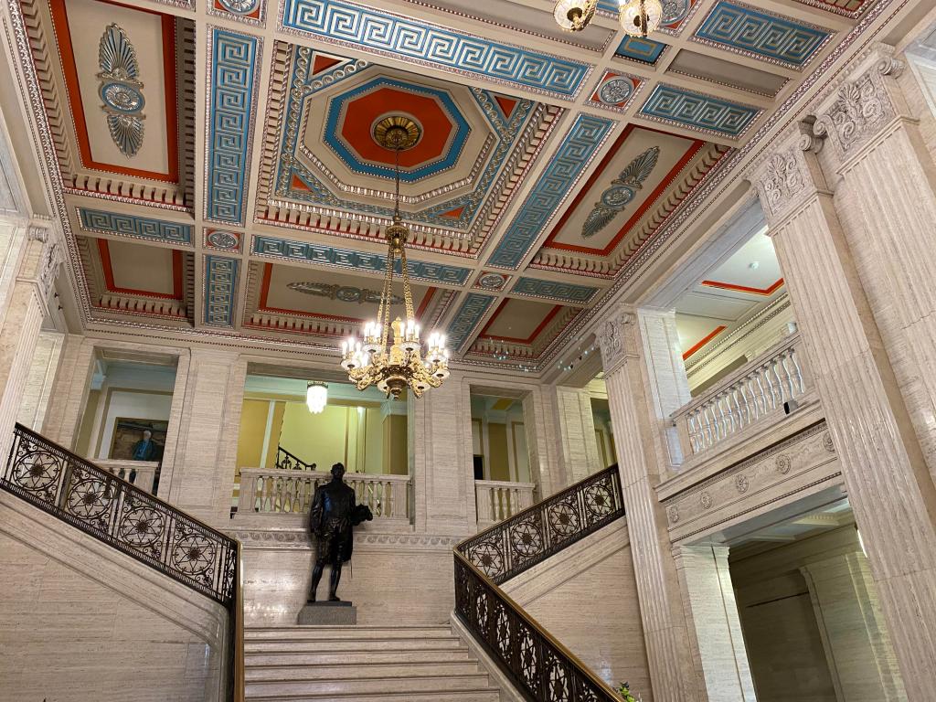 You probably recognise this building as a backdrop to various news reports on Northern Irish politics and it was here that the 700 hours of negotiations to secure the Good Friday Agreement took place. Its official name is ‘The Parliament Buildings’ of Northern Ireland, reflecting the original plan to have two separate office and parliament buildings, but as is so often the case with public projects – the money ran out and both functions were combined into one new building, by relatively little-known architect Arnold Thornely (1870-1953). Architecturally, perhaps what’s most surprising about it is that it was commissioned in the early 1920’s and officially opened in 1932.