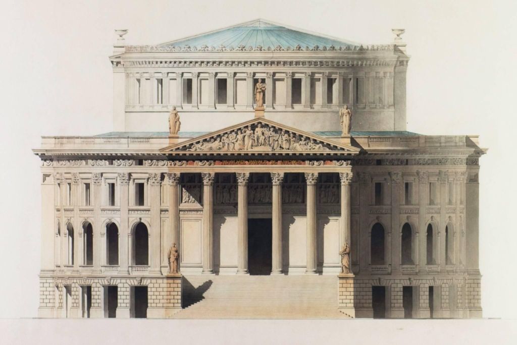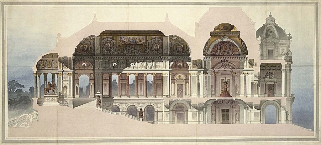 Even the method of developing a design was prescribed in detail, with students having to quickly produce a sketch or ‘esquise’, which must contain all the key elements of their proposed solution. Once their ‘esquise’ was accepted, an appropriate Classical order would be selected and the design further developed until it was presented as an ‘analytique’, which would be beautifully rendered in monochrome, before finally developing the design fully in plan, section and elevation, in a coloured ‘analytique rendu’. The standards expected were exceptional, and beautifully composed drawings with their immaculate draftsmanship and perfectly rendered shadows were required of all students if they were to receive medals for their work.