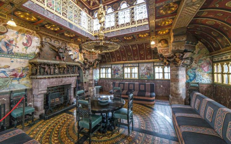 At Cardiff, Burges completely remodelled the existing accommodation within the castle as well as adding four towers, the tallest of which concluded in a double-height ‘Summer Smoking Room’ from which Lord Bute could look out to sea to the south and to the mountains of Wales to the north through an almost unbroken band of windows. One of the other towers provided a Guest Suite and within the existing accommodation he created an astonishing multi-vaulted Arab Room (largely inspired by his visit to Constantinople), a Chaucer Room, Nursery, Library, and Banqueting Hall, bedrooms for both Lord and Lady Bute and a vast new boundary wall topped with various animal sculptures. Castell Coch was completely restored from its ruined state and provided a similarly romantic summer lodge for Lord and Lady Bute.