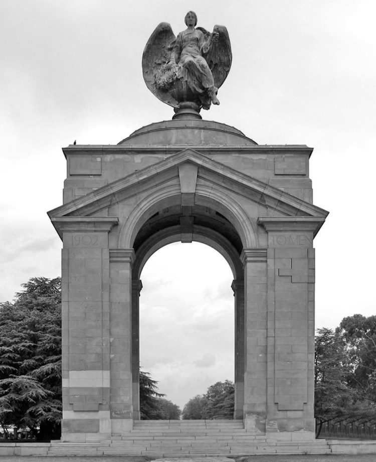 Lionel Phillips had gifted a site to the city on which he wished to be erected a memorial to the British who had lost their lives in the Second Boer War (the Rand Regiments Memorial) and on Lutyens’ arrival, he enquired if he’d be good enough to also undertake the design of the monument, for which public funds had already been raised. Lutyens again obliged and produced what turned out to be one of his first and finest triumphal arch memorials. Hugh Lane advised on the appointment of a sculptor for the bronze Angel of Peace (which Phillips paid for himself) and the Russian sculptor Naoum Aronson provided the appalling bronze blob which almost crushes Lutyens’ elegant arch. Lutyens and Baker parted as friends, but their long and so far happy relationship would not last even the first few months of finally working together as partners in India just two years later.