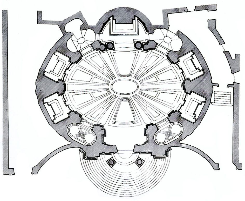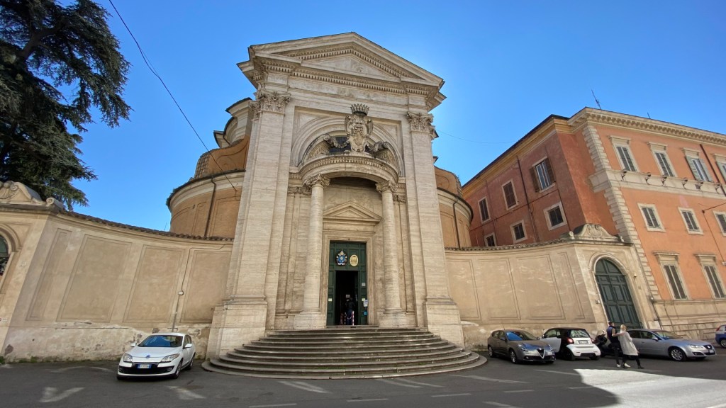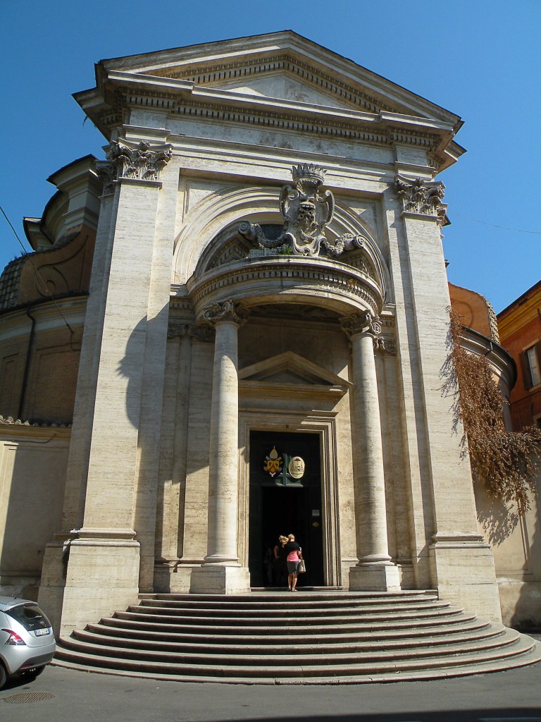 Like so many Roman churches, the exterior of the building is in a remarkably plain red brick and it is only the main entrance elevation which is in stone. This is set back slightly from the road to create a small space in front of the church which is enclosed by low quadrant walls and down into which the entrance steps cascade, setting up a certain dynamism between the concave and convex geometries. Below the pediment, a semi-circular porch steps forward and bears the coat of arms of Cardinal Camillo Francesco Maria Pamphili, Bernini’s patron on this occasion. In terms of Baroque Rome, this is an extremely restrained façade and is designed to lower expectations before entering the church.