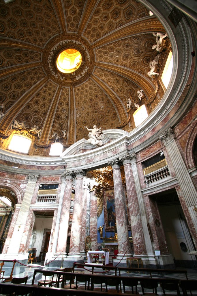 The plan of the church is oval, with the altar directly ahead almost overwhelming the visitor as soon as they enter. Borromini’s church, San Carlo alle Quattro Fontane, which is just a little further down the same road, is also oval in plan but with the altar on the long axis, giving it a greater sense of tranquility but by, most unconventionally, turning the oval through 90o, Bernini has created a powerful feeling that the entire space is being squeezed, making the high altar almost overpowering and making the niche at its rear, which is lit from above, the inescapable focus of the entire composition.
