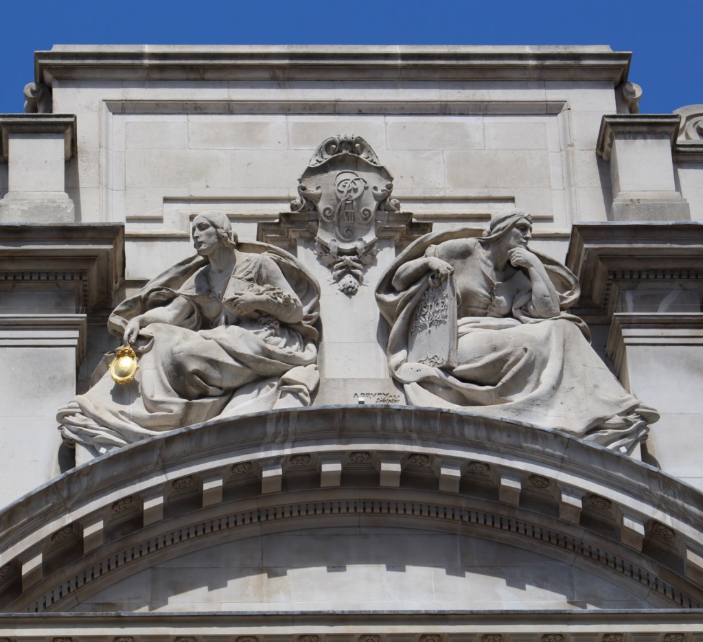 By the end of the 19th century (largely as a result of the formation of The Art Workers Guild), many of the finest sculptors were contributing architectural sculpture too, and the contributions of George Frampton (1860-1928), in sculpting the great bronze ‘St Mungo’ and overseeing the entire programme of sculpture on the Glasgow Art Gallery and Museum, Alfred Drury (1856-1944), in providing the haunting images representing ‘War’ on the Old War Office in Whitehall and Gilbert Bayes , whose ‘Queen of Time’ still looks down on Selfridges main entrance on Oxford Street, represent some of the best British sculpture of the period.