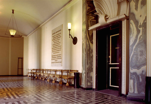 The courtyard represents ‘Law and Order’ in all its majesty, raised above the everyday level of life on the streets outside and bringing dignity to its pursuit. A further courtyard (reached by a low unadorned shaft through the ring of offices) is an equally dramatic memorial to police officers killed in the line of duty, enclosed by two rows of three-storey high Corinthian columns and with Einar Utzon-Frank’s sculpture The Snake Killer as its focus. The interiors, completed after Kampmann’s death by his assistants, are exquisite, complete with the original fittings and much of the furniture, and are beautifully maintained.